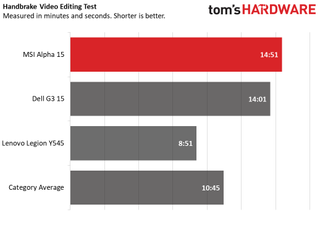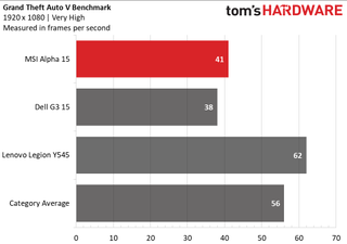 In most cases, the Alpha 15’s numbers were close to those of two laptops with GTX 1650 GPUs that we've tested: the Dell G3 15 and Lenovo Legion Y545. The Dell packs an Intel Core i5 CPU, while the Legion uses an Intel Core i7.