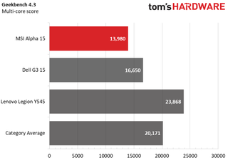 On the Geekbench 4.3 overall performance benchmark, the Alpha 15 earned a score of 13,980, falling below the mainstream gaming average (20,171), as well as the Lenovo Legion Y545 (23,868 with an Intel Core i7-9750H and 16GB of RAM). But it’s a higher score than the Dell G3 15 (16,650, Intel Core i5-9300, 8GB).