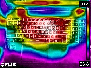 We took skin temperature readings while running our stress test with Metro Exodus. It measured 28.7 degrees Celsius (83.7 degrees Fahrenheit) on the touchpad and 38.4 degrees Celsius (101.1 degrees Fahrenheit) between the G and H keys on the keyboard.