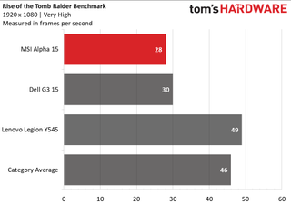 On the Rise of the Tomb Raider benchmark at FHD resolution with very high settings, the Alpha ran the game at 28 fps, below the 46-fps mainstream gaming average, as well as both the Dell G3 and the Legion. It’s also below what we consider playable (a minimum of 30 fps).