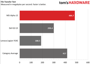The Alpha copied 4.97GB of files in 11 seconds, a rate of 484.7 MBps. That’s faster than both the Dell G3 and the Legion, as well as the average (417 MBps).